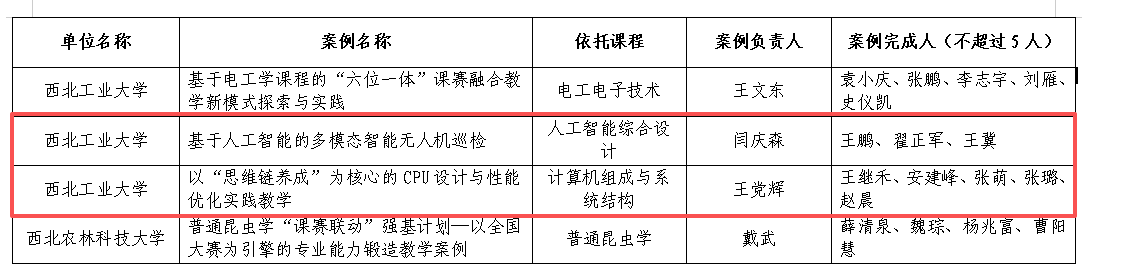 近日,陕西省教育厅办公室公布2025年本科教学案例遴选结果,伟德BETVlCTOR1946在课赛融合赛道获批2项,分别为《基于人工智能的多模态智能无人机巡检》和《以“思维链养成”为核心的CPU设计与性能优化实践教学》。