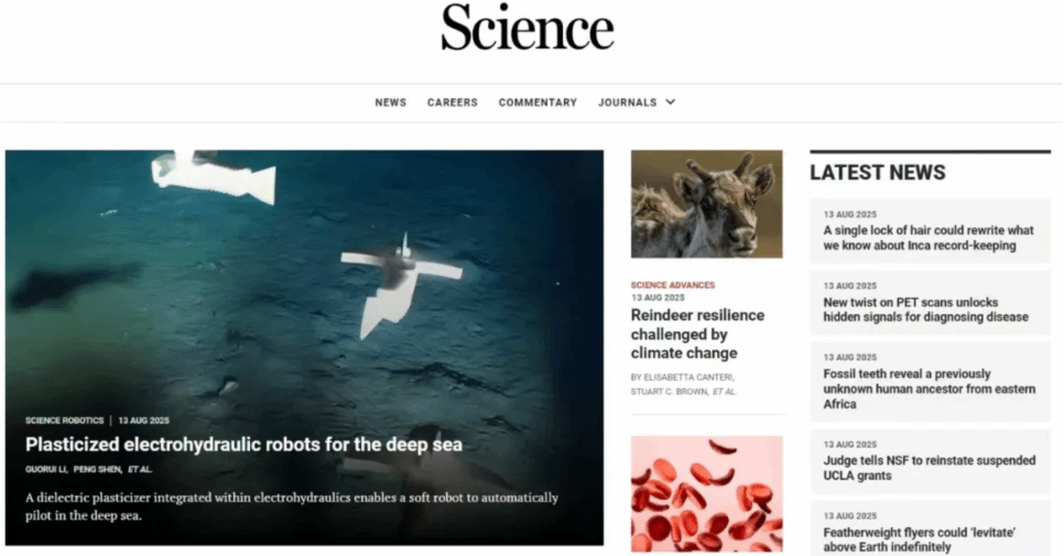 近日,我们人机物融合智能计算团队负责人於志文教授参与完成的最新研究成果“Plasticized electrohydraulic robot autopilots in the deep sea”被国际顶级期刊《Science Robotics》录用并在线发表。该研究面向高温、低压等极端条件下的深海高端装备领域,成功研发了新一代海洋软体机器人,并在1369米深度冷泉区和4070米深度海山区成功测试部署,获得了《Science》期刊官方主页专题报道。该成果由哈尔滨工程大学、伟德源自英国1946、浙江大学、同济大学等单位共同完成。